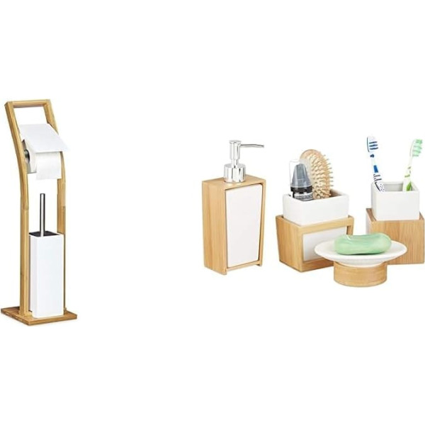 "Relaxdays" medinis stovintis tualeto šepečio laikiklis, aukštis 75 x aukštis 19 x 19 cm, bambuko, natūralios baltos spalvos ir vonios kambario rinkinys, 4 dalių vonios kambario reikmenys iš keramikos ir bambuko, natūralios baltos spalvos, 10 x 14
