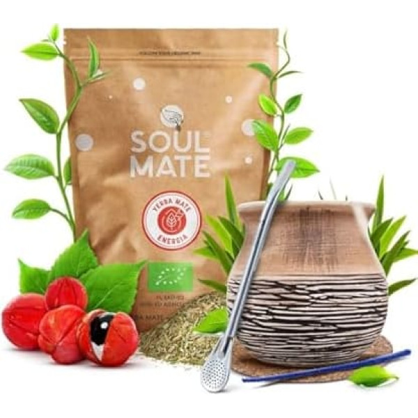 Yerba Mate rinkinys - Soul Mate Orgánica Energia 500 g | Keraminis kalabušas | Nerūdijančio plieno "Mercedes" bomba | Priedai (padėkliukas ir valymo šepetėlis)