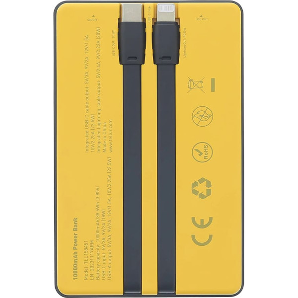 Tellur Power Bank 10000mAh, USB-C + Lightning cables built-in yellow